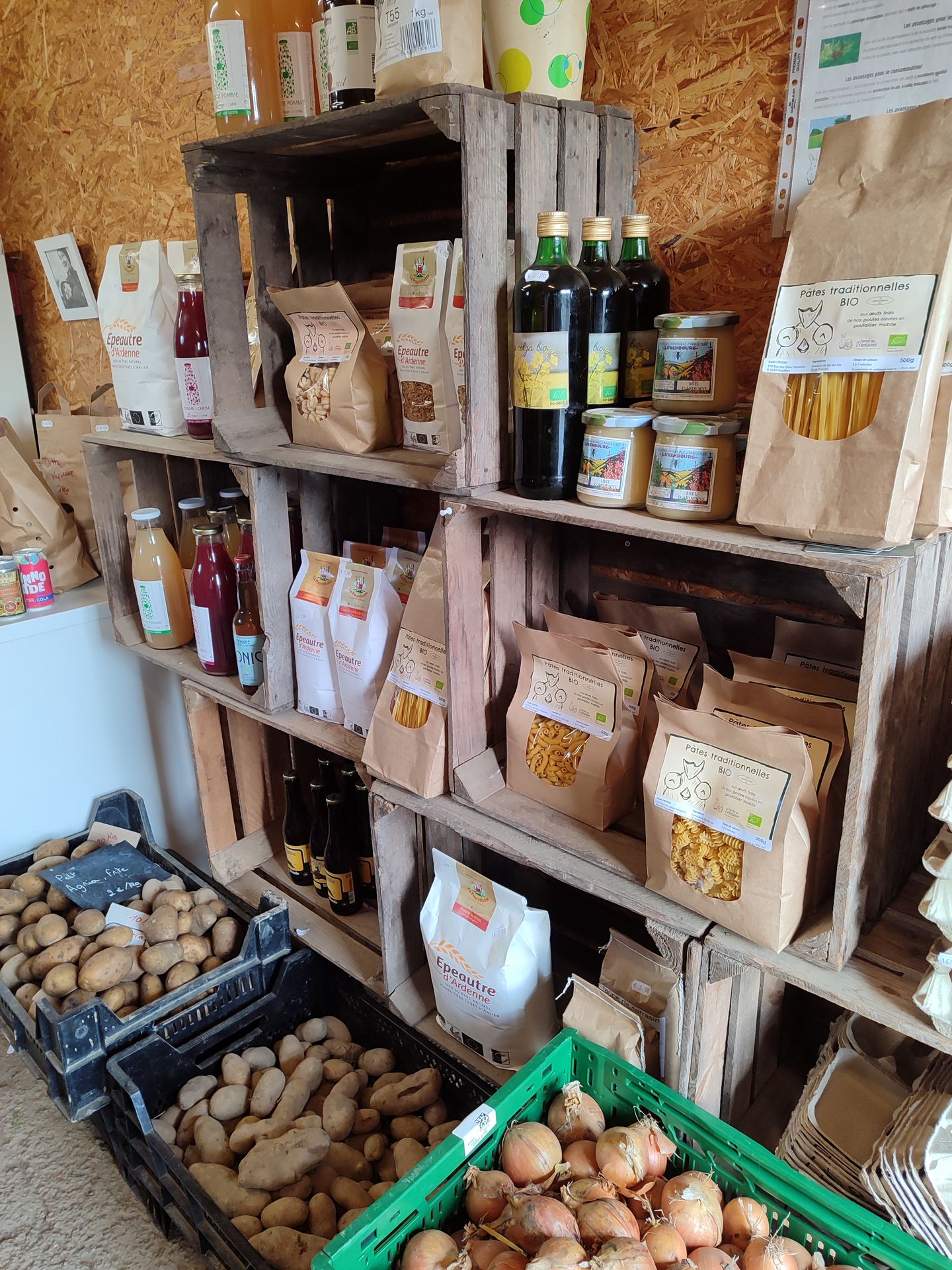 Nous proposons des produits bio issus de notre ferme (légumes, œufs, viande, pâtes aux œufs, ...), ainsi que des produits venant de producteurs de la région.